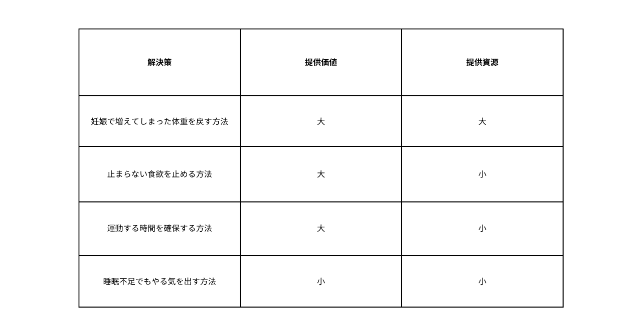 次に、それぞれの課題・解決策に対して顧客にとっての価値である「提供価値」と顧客に提供する際に要する資源(時間、手間、コスト etc)を大小に分ける。下記のような大雑把な形でok: